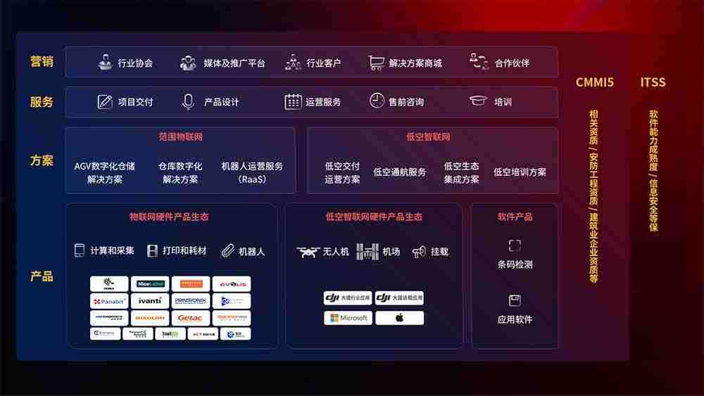 聚合国内外先进的物联网硬件产品品牌,,,,聚焦数字化仓储、、、、机器人运营、、、低空智联网等领域,,共同打造适合客户业务场景的解决方案并提供交付服务